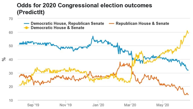 Rychlost a hloubka recese nastupující po pandemii covidu-19 převrací původní strategii Donalda Trumpa, který zakládal svou kampaň na silné ekonomice. Žádný úřadující prezident kromě Calvina Coolidge v roce 1924 nevyhrál opět volby, pokud byla v průběhu 24 měsíců předcházejících volbám recese. A pokud se změní prezident, je pravděpodobné, že se rozložení sil změní také v Senátu, což umožní demokratům kontrolovat jak exekutivní, tak legislativní větev vlády.