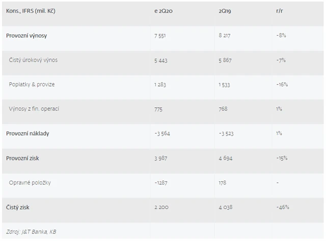 Podle analytika Milana Lávičky z J&T Banky vykáže Komerční banka za druhé čtvrtletí na úrovni čistého zisku výrazný pokles (-46 %) způsobený propadem příjmů a nárůstem rizikových nákladů. "Za druhé čtvrtletí čekáme propad čistého úrokového výnosu o 7 % na 5,44 miliardy Kč s tím, že ve druhé polovině roku by pokles měl být ještě o něco výraznější. Restriktivní opatření a prakticky zastavení ekonomiky se ještě výrazněji projeví ve výnosech z poplatků, kde očekáváme propad o 16 %. Provozní náklady by měly zůstat relativně pod kontrolou. Na rozdíl od některých jiných finančních domů Komerční banka v prvním kvartálu nevytvářela výrazné opravné položky, o to vyšší tak zřejmě budou nyní. V projekci počítáme s tvorbou opravných položek ve výši 1,3 miliardy Kč, respektive 79 bazických bodů. Další vysoké rizikové náklady lze očekávat i ve druhé polovině roku," napsal Lávička.