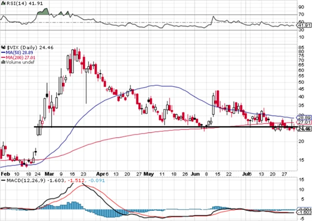 Index volatility VIX je pod 200denním klouzavým průměrem a mírně pod 25. Akciový index posiluje, ale VIX se sotva hýbe. Pro akcie tak nadále vysílá přinejlepším smíšený signál.