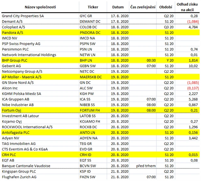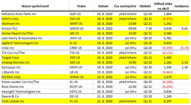 Níže najdete odhady výsledků jednotlivých společností, které oznamují hospodářská čísla v následujícím týdnu.
