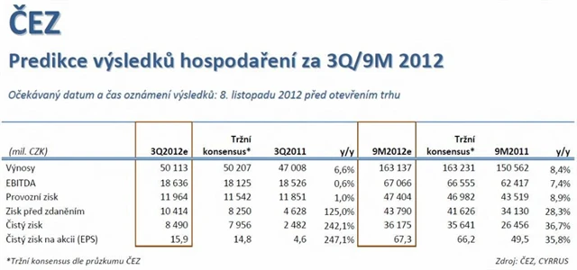 Z pohledu výsledků za třetí kvartál neočekáváme v základním scénáři odpis albánských aktiv, i když jej nelze vyloučit. Naopak počítáme s pozitivním přeceněním opcí MOL (+0,8 miliardy Kč). Zisk před zdaněním projektujeme ve výši 10,4 miliardy Kč a čistý zisk pro akcionáře ČEZ 8,5 miliardy. Takové výsledky by podle nás znamenaly, že ČEZ je přibližně o 2 miliardy Kč nad celoročním plánem zisku. Vzhledem k situaci v Albánii a dalším rizikům je však možné, že firma svoji guidance nezvýší.