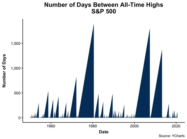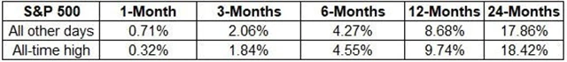 Současná situace je bezprecedentní v tom, co propady trhu způsobilo a jak na prvotní paniku investorů zareagovaly centrální banky a vlády. Pokud bychom ale od tohoto odhlédli, další vývoj na americkém akciovém trhu může naznačit následující tabulka. Ta ukazuje, že v období do tří měsíců mají ceny akcií po dosažení historických maxim tendenci růst o něco pomaleji, avšak v půlročním, ročním a dvouletém horizontu naopak rychleji.
