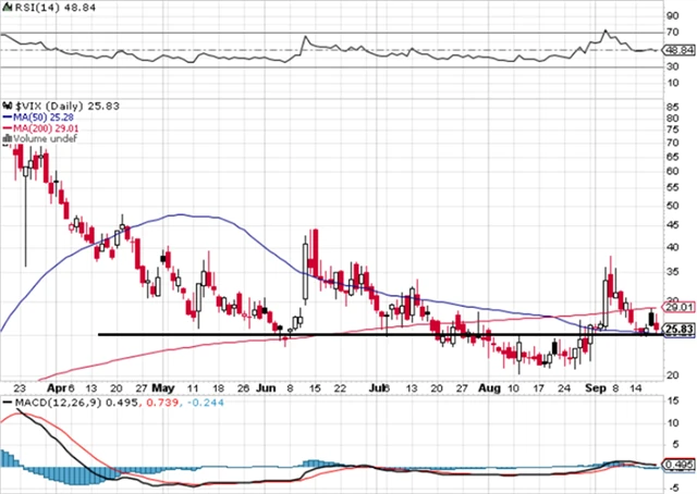 Index volatility VIX byl 4. září na 38 bodech, nyní je na 25. I přes pokles cen akcií tedy celkově klesá volatilita. Příslibem je to, že se index strachu drží pod 200denním klouzavým průměrem. Při pátečním poklesu cen akcií o více než procento VIX nepředvedl nic dramatického, což se jeví jako příznivý signál.