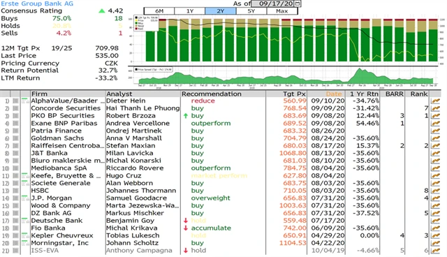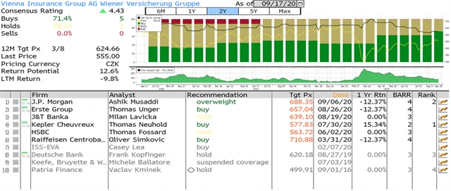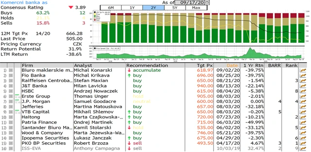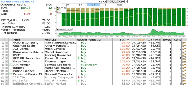 Jaký názor mají na akcie Monety Money Bank, Erste Group Bank, Komerční banky a Vienna Insurance Group domácí a zahraniční analytici? Jaké jsou jejich dvanáctiměsíční cílové ceny a jak znějí jejich aktuální investiční doporučení? Nabízíme jejich přehled, jak jej k 17. 9. 2020 shromáždila agentura Bloomberg. (23. 9. 2020)