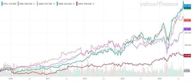 Zmíněná pětice sestává z firem PayPal (platební systém, jediné opravdu velké jméno ve výběru), Autodesk, ServiceNow (stejně jako PayPal jsou to technologické společnosti zabývající se digitalizací byznysu, respektive automatizací pracovních procesů), Intuitive Surgical a Vertex Pharmaceuticals (zástupci sektoru zdravotní péče; první se zabývá robotizací chirurgie, druhá vyvíjí genové terapie).