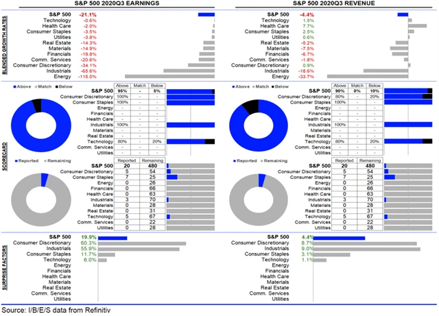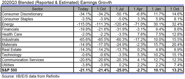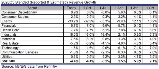 Jak se vyvíjejí odhady růstu či poklesu zisků a tržeb amerických firem za 3Q2020?