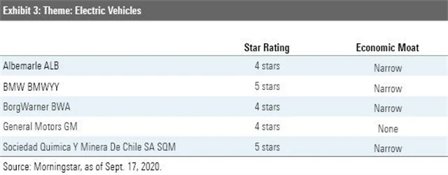 Podle Morningstar bude v roce 2030 každé páté auto na světě jezdit na elektřinu. Do pěti let analytici čekají vyrovnání celkové nákladovosti aut na elektřinu s náklady spojenými s nákupem a provozem klasických vozidel se spalovacími motory (náklady včetně kupní ceny, provozu, likvidace). Příležitosti vedle samotných akcií automobilek firma vidí například i mezi producenty lithia.