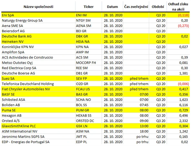 Které světové firmy představí výsledky hospodaření za uplynulý kvartál v týdnu od 26. října a jaké zisky v rámci indexů S&P 500 a STOXX Europe 600 očekávají analytici oslovení agenturami Refinitiv a Bloomberg?