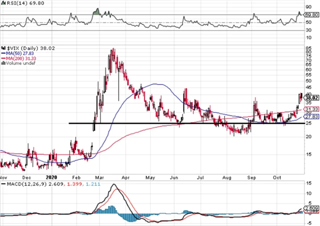 Index volatility VIX je nad klouzavými průměry a výše než na začátku září, kdy akciový index S&P 500 spadl o více než 10 %. Pro akcie vysílá nyní index strachu jednoznačně nepříznivý signál.
