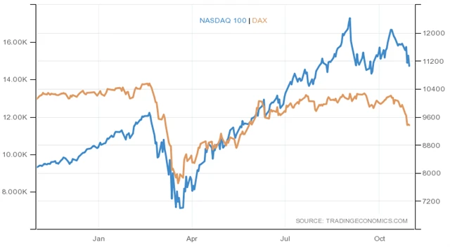 I když se jedná o pandemii stejného koronaviru, aktuální situace je odlišná. Na jaře přišel rychlý stimul, investoři se uklidnili a příchod tvrdých opatření již provázela stabilizace trhu. Index DAX dosáhl minima v polovině března, a to mezi oznámením lockdownu Francie a Německa. Podobné oznámení přišlo na konci října, tentokrát jsme se však dočkali rozhodnutí z obou zemí v jediný den. Znamená to, že výprodej na trzích opět brzy skončí?
