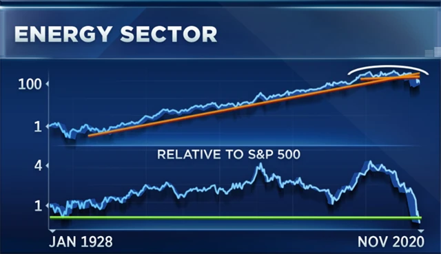 Na nejhlubší relativní propad cen akcií z odvětví tradiční energetiky v USA, do kterého spadají zejména velké těžební společnosti (ropa, plyn, uhlí) a na ně navazující firmy, upozornil ve vysílání CNBC uznávaný technický analytik Ari Wald ze společnosti Oppenheimer.