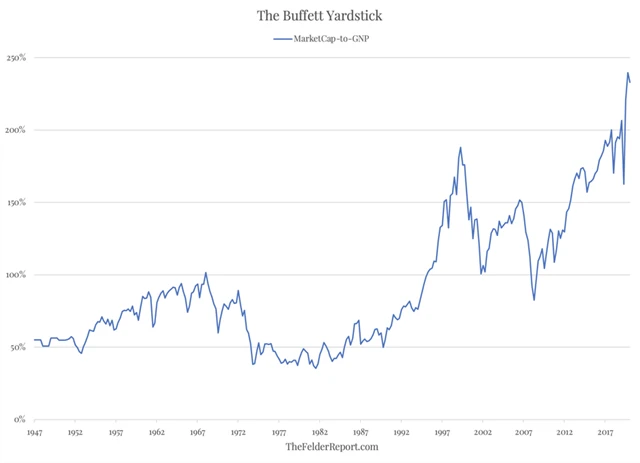 Jedním z nejspolehlivějších ukazatelů ocenění akciového trhu je podle legendárního investora Warrena Buffetta poměr tržní kapitalizace k hrubému domácímu produktu. A ten se aktuálně v případě Spojených států nachází na historických maximech. Jinými slovy, americké akcie ještě nikdy nebyly tak drahé. Aby také ne, když Wall Street je na maximech, zatímco ekonomice podráží nohy koronavirus.