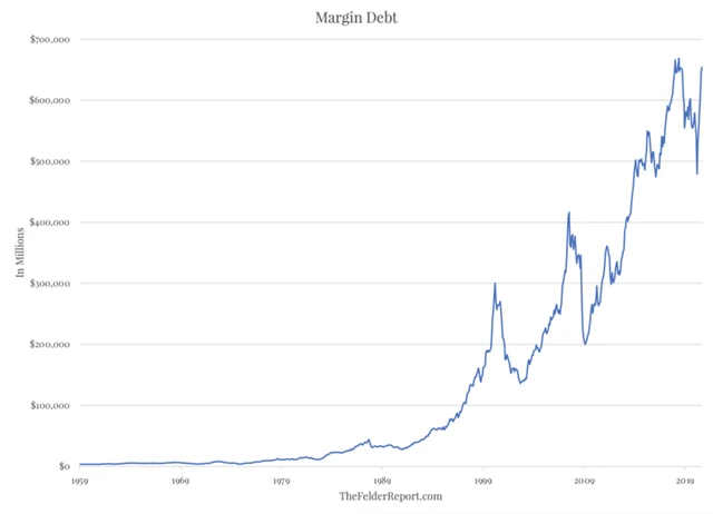 Ocenění akciového trhu z hlediska sentimentu lze dobře posoudit pomocí takzvaného margin debt, tedy úvěrů na obchodování s akciemi. Také ty ukazují, že investoři jsou extrémně býčí, i v tomto případě je ukazatel na historických maximech.