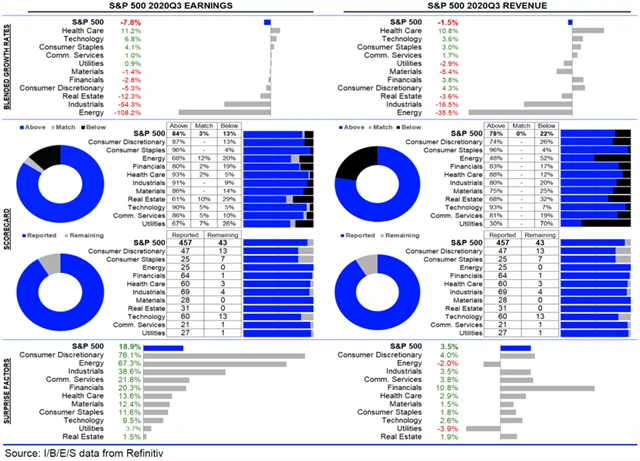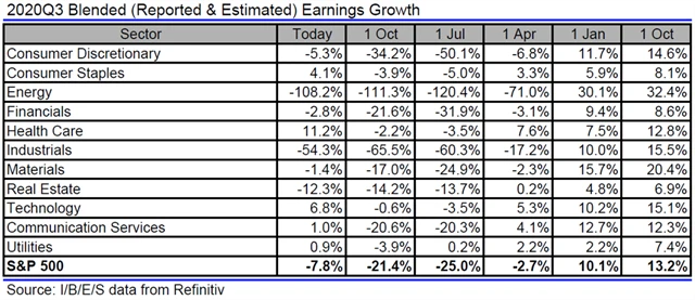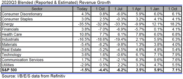 Jak se vyvíjejí odhady růstu či poklesu zisků a tržeb amerických firem za 3Q2020?