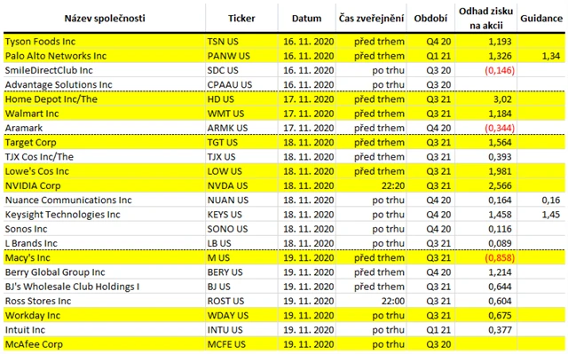 Které světové firmy představí výsledky hospodaření za uplynulý kvartál v týdnu od 16. listopadu a jaké zisky v rámci indexů S&P 500 a STOXX Europe 600 očekávají analytici oslovení agenturami Refinitiv a Bloomberg?