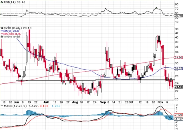 Index volatility VIX se opět posunul o něco níže. Je pod 25 a brzy by mohl atakovat letošní minima na 20 bodech.