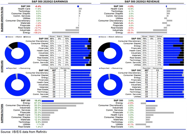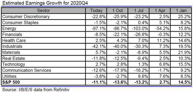 Jak se vyvíjely odhady růstu či poklesu zisků a tržeb amerických firem za 3Q2020?
