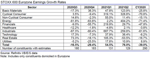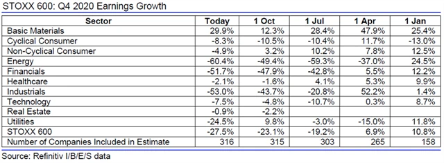 Jak se vyvíjejí odhady růstu či poklesu zisků evropských firem za 4Q2020?