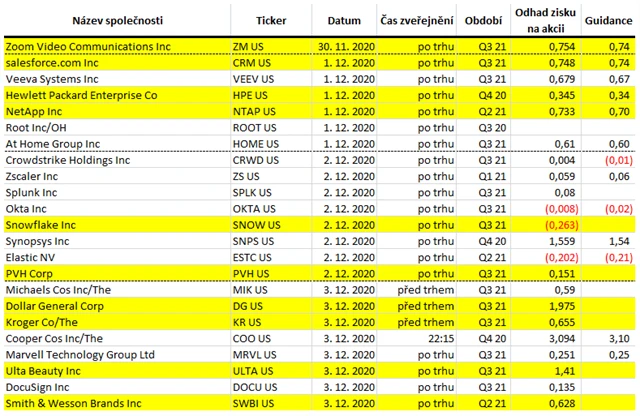 Které světové firmy představí výsledky hospodaření za uplynulý kvartál v týdnu od 30. listopadu a jaké zisky v rámci indexů S&P 500 a STOXX Europe 600 očekávají analytici oslovení agenturami Refinitiv a Bloomberg?