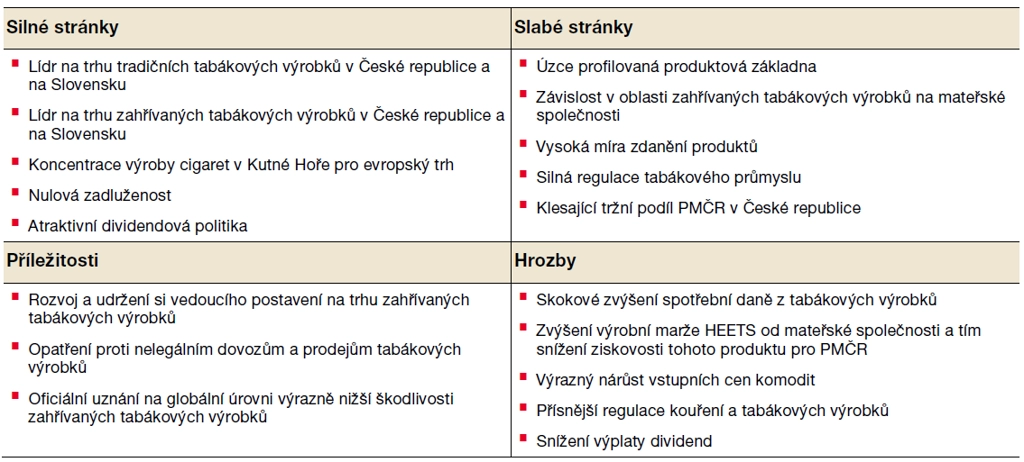 Společnost Philip Morris je lídrem na trhu tradičních cigaret a také na rychle se rozvíjejícím trhu s novými technologiemi (zahřívaným tabákem) v České republice i na Slovensku. Firma má tradičně velice silný finanční profil, je bez dluhů a vyplácí velice atraktivní dividendu.