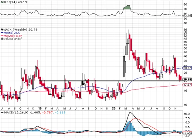 Index volatility VIX se za týden neposunul, ačkoli akcie posílily. Hodnota 20 bodů začala fungovat jako support. I tak VIX pro akcie vzhledem k letošnímu vývoji vysílá pozitivní signál.
