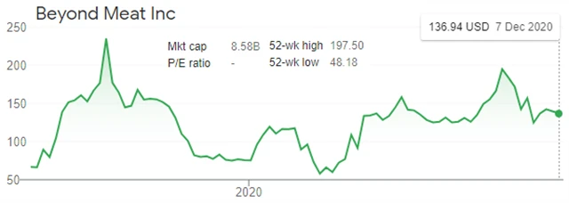 Výrobce náhražek masa byl po úspěšném IPO na jaře 2019 jednou z burzovních hvězd a i za letošní rok přidává desítky procent. Hospodářské výsledky za druhé a třetí čtvrtletí ovšem nenaplnily očekávání. Partnerství s McDonald's může být pro firmu dlouhodobě jak pozitivní (pokračující dodávky globálnímu řetězci), tak může jít o silný protivítr (společnost McDonald's může ve větší míře nakupovat od jiných dodavatelů, případně začít náhražky vyrábět sama, jakkoli spekulace o tom na podzim nebyly potvrzeny). Podle JPMorgan je nyní nejistota ohledně dalšího vývoje hospodaření Beyond Meat tak silná, že nemá smysl ze široké nabídky akcií vybírat k nákupu právě akcie této firmy.