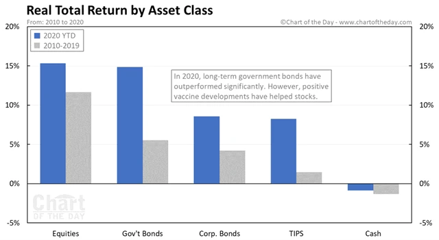 Americké akcie v uplynulé dekádě nechaly za sebou jak vládní bondy, tak hotovost nebo inflačně zajištěné dluhopisy. Letos ovšem právě americké treasuries předvádějí výjimečnou jízdu (vzhledem k prudkému propadu ekonomiky, nízkým inflačním očekáváním a zároveň štědré podpoře hospodářství to jakžtakž dává smysl). Díky rychlému vývoji vakcín na covid-19, nadějím na oživení hospodářství a také bilionům dolarů vypouštěných do ekonomiky ovšem akcie drží krok.