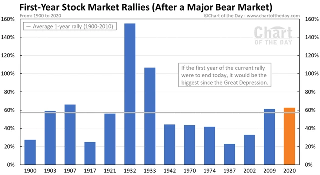 Šlo přitom o bleskový medvědí trend, dokonce pak o nejrychlejší více než 30% sešup v historii. Následný růst cen akcií (a teď už je řeč o sektorově šířeji založeném indexu) byl a stále je podobně ohromující. I kdyby americké akcie až do konce března 2021 zůstaly na současných úrovních, šlo by o nejvýraznější roční rally zahájenou po medvědím trendu od doby Velké deprese.