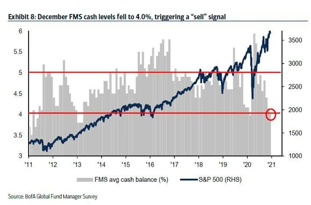 Podíl hotovosti v portfoliích podílových fondů zaměřených na americké akcie se v prosinci snížil ke 4 %. To je podle Bank of America zřetelný prodejní signál uprostřed rozsáhlé nákupní horečky spojené s nadějemi na brzké proočkování populace vakcínami proti covidu-19 a na s tím související opětovné otevření ekonomiky a návrat k předkoronavirovému normálu.