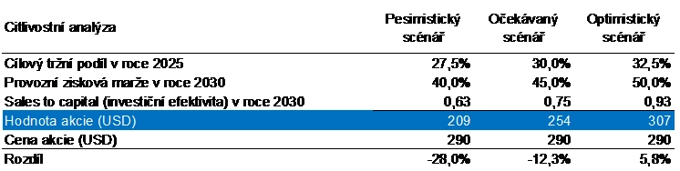 Pro zachycení variability stanovené hodnoty přikládám několik scénářů možného vývoje z pohledu klíčových proměnných. Za klíčové proměnné považuji cílový podíl na trhu digitální reklamy, provozní ziskovou marži a efektivitu investic v podobě podílu tržeb a investovaného kapitálu.