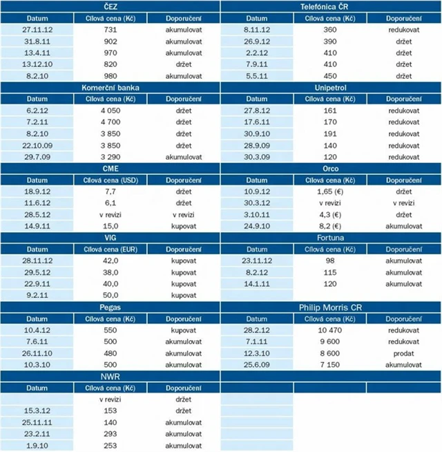 Cílové ceny a slovní doporučení na akcie z pražské burzy, které pokrývají analytici z České spořitelny.
