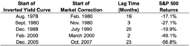 Následující tabulka zachycuje hned několik případů, kdy ve Spojených státech krátce po přechodu výnosové křivky do inverzního postavení hospodářství spadlo do recese. V průměru uplynulo mezi těmito dvěma událostmi 17 měsíců.