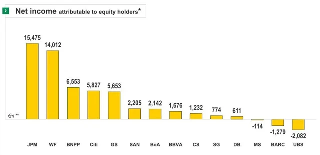 Nejlepšího výsledku v oblasti čistých příjmů pro akcionáře dosáhla loni americká banka JPMorgan, hned v závěsu za ní se drží Wells Fargo. Trojici nejlepších uzavírá francouzská banka BNP Paribas, která však za poslední čtvrtletí roku 2012 vykázala meziroční pokles zisku o 32,8 % na 514 milionů eur.