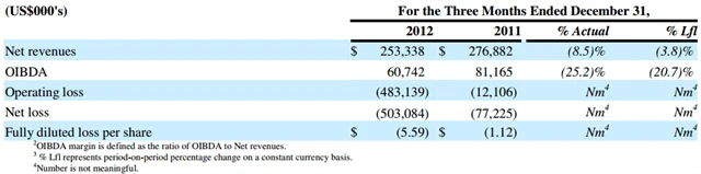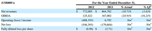 Provozní ztráta CME za rok 2012 byla 488,2 milionu USD v porovnání s provozním ziskem 6,8 milionu USD o rok dříve. Firma za loňský rok zaúčtovala ztrátu ze snížení hodnoty aktiv ve výši 522,5 milionu USD.