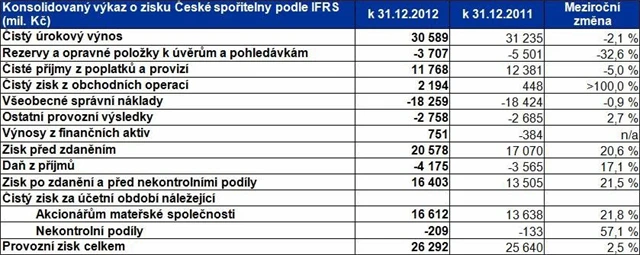 Česká spořitelna zvýšila v roce 2012 konsolidovaný čistý zisk (IFRS) o 21,8 % na 16,61 miliardy Kč, provozní zisk se zvýšil o 2,5 % na 26,29 miliardy Kč.