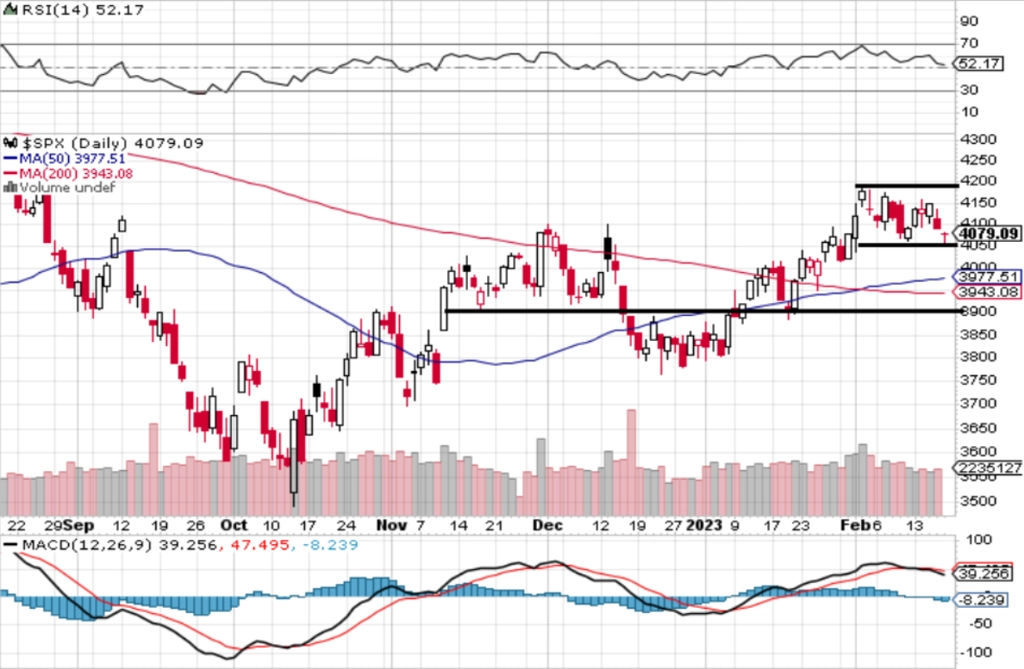Index S&P 500 koriguje překotný lednový růst a je v úzkém rozpětí 4 200 až 4 050. Širší pásmo je 3 900 až 4 200. Trh v současnosti "netrenduje" ani jedním směrem, v rozpětí by tedy mohl ještě nějakou dobu zůstat.