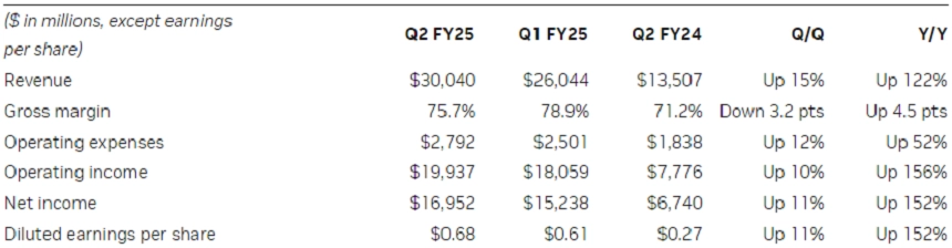 Americký výrobce čipů NVIDIA po konci středečního obchodování ve Spojených státech oznámil, že v druhém čtvrtletí svého fiskálního roku hospodařil s čistým ziskem 16,6 miliardy USD. Upravený zisk na akcii dosáhl 0,68 USD. Tržby podniku se meziročně více než zdvojnásobily na rekordních 30 miliard USD. Zisk i výnosy firmy překonaly očekávání analytiků, akcie Nvidie ale přesto v poobchodní fázi zamířily hluboko do červených čísel.