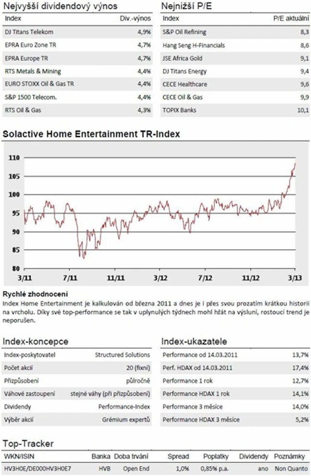 Společnost Structured Solutions, která se specializuje na kalkulaci individuálních benchmarků, vytvořila již v březnu odpovídající index pro Home Entertainment. Ten obsahuje celkem 20 mezinárodních akciových titulů, které vybírá komise odborníků. Z užšího výběru nakonec do portfolia vstoupilo pět největších společností ze čtyř segmentů: hardware, herní konzoly a jejich software, televizní společnosti a filmová produkce a distribuce.