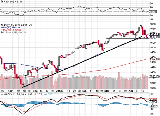 Index S&P 500 v pondělí také bez zjevného důvodu otevřel níže a uzavřel s denní ztrátou 2,36 %. Ve čtvrtek pak závěrečná cena skončila na 50denním klouzavém průměru a na silném supportu 1 540 bodů. Přestože byla trendová čára se začátkem v polovině listopadu 2012 prolomena, graf zůstává v býčím nastavení. Až závěrečná cena pod 1 540 bude signalizovat převahu medvědů. Další vývoj budou určovat především další výsledky firem, například Applu, Caterpillaru, Boeingu nebo Exxonu.