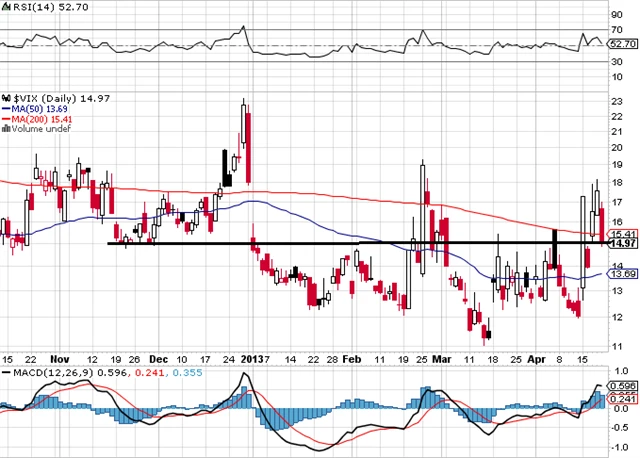 Index S&P 500 se dostal pod tlak hned v pondělí. Zejména poslední půlhodina obchodní seance byla hodně "živá", cenu táhla dolů zpráva o výbuchu na maratonu v Bostonu. Index volatility VIX přidal téměř 40 %.