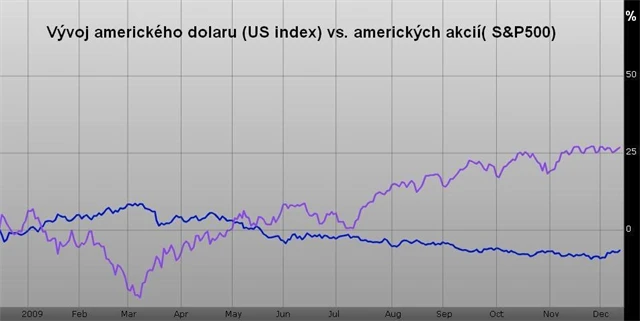 Mezi dolarem a akciemi by mohla nastat pozitivní korelace, akcie by se mohly začít pohybovat stejným směrem jako dolar.