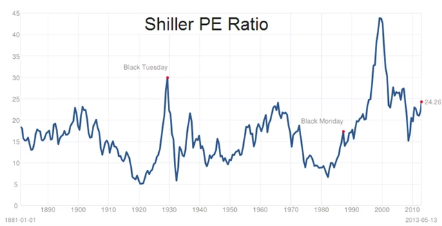 Jednou z populárních valuačních technik je Shillerovo P/E (10letý průměr ceny a zisku na akcii). V případě S&P 500 je nyní zhruba 24 ve srovnání s "předbublinovým" průměrem kolem 15.