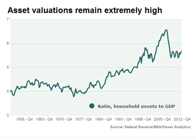 Hodnota aktiv je v současnosti lehce nad pětinásobkem HDP. Toto extrémně vysoké číslo bylo překonáno jen v dobách nafukování technologické bubliny na konci 90. let a v prvním desetiletí 21. století. Průměr z 50. let až do roku 1980 byl 3,7násobek HDP. Poměr se mezi lety 1951 až 1986 vyšplhal na hodnotu 4 jen v jednom případě (v roce 1961), tedy v období relativně vysokého ekonomického růstu a rovnoměrné distribuce příjmů a bohatství.