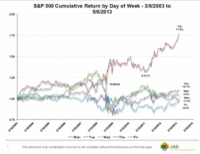 Graf neošidíte. Úterý v posledních 10 letech jednoznačně překonává všechny ostatní obchodní dny, pokud jde o výkonnost amerických akcií měřenou indexem S&P 500.