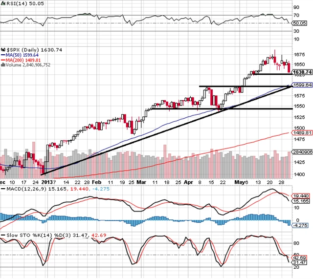 Denní graf ovšem i tak zůstává v býčím nastavení, páteční zavírací cena je v oblasti prvního supportu 1 625 až 1 630 bodů. Na týdenním grafu ale svíčky poprvé od října 2012 vytvořily novou nižší cenu. Důležitý je support na psychologické hladině 1 600, který je ještě zesílen rostoucí trendovou čárou a 50denním klouzavým průměrem. Navíc je zde odskok mezi zavírací cenou z 2. a otevírací cenou z 3. května.
