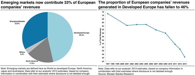 Evropské akciové trhy letos předvádějí velice slušný výkon, ačkoli je ekonomika starého kontinentu stále v recesi. Podobně jako v USA v posledních letech firmám rychle roste podíl tržeb z rozvíjejících se trhů. A právě tato schopnost nacházet odbyt v oblastech s rychlejším růstem ekonomiky by i do budoucna měla velké evropské firmy držet nad vodou.