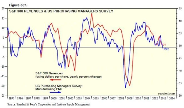 Jasně to ukazuje graf růstu tržeb firem z indexu S&P 500 a indexu průmyslové aktivity ISM. Jejich korelace podle Yardeniho naznačuje, že růst tržeb bude nižší. Výhledy analytiků, které pravidelně shromažďuje agentura Thomson Reuters, se v květnu prudce snížily na 2,2% růst v roce 2013 a 4,4% růst v roce 2014. Mají-li americké akcie pokračovat v růstu jakžtakž "zdravým" způsobem, potřebují ale oporu právě v tržbách.