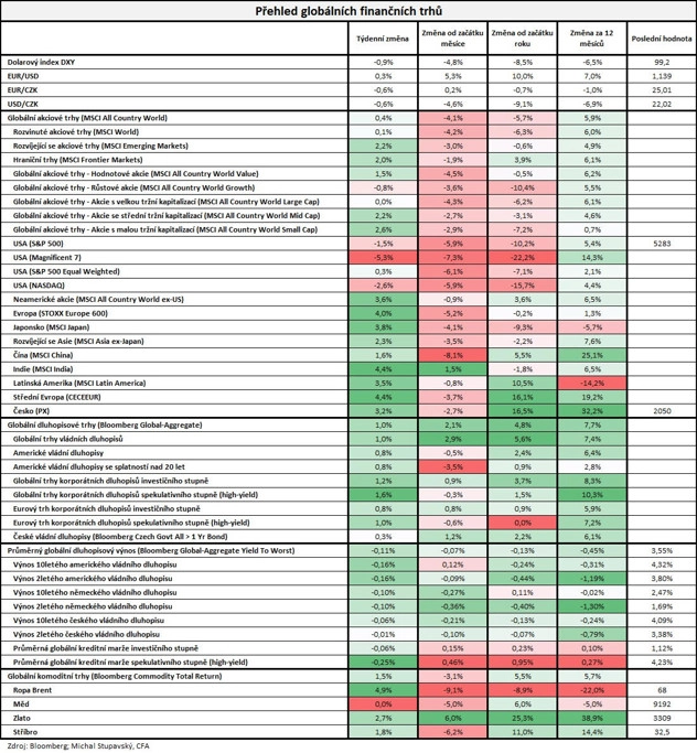 "Vývoj na globálních trzích byl výrazně klidnější než v týdnu předchozím. Primárním důvodem bylo oznámení americké administrativy, že se zavedením celních opatření počká 90 dní (s výjimkou Číny). Ve výsledku nejširší globální akciový index MSCI All Country World vzrostl o 0,4 %. Výrazně se nicméně nedařilo akciím firem z takzvané úžasné sedmičky, jejichž index spadl o 5,3 % a od začátku roku ztrácí 22 %," doplnil stratég Michal Stupavský ze společnosti Conseq Investment Management.