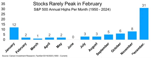 Fandové burzovního almanachu, kteří by chtěli hledat pomyslný jazýček na vahách mezi býčím a medvědím výhledem pro zbytek roku, pak mají v záloze následující statistiku. Čísla u jednotlivých měsíců vyjadřují, kolikrát index S&P 500 dosáhl kurzového maxima v daném roce v tom kterém kalendářním měsíci. Letos zatím vrchol nastal v únoru, což je přitom historicky velice netypický měsíc pro roční maxima. Takže jestli má být letošní rok alespoň v něčem "průměrný" nebo "běžný", měl by index únorový historický rekord do prosince stihnout překonat. Aktuálně na něj ztrácí 300 bodů, potřebuje tedy získat něco málo přes 5 %.