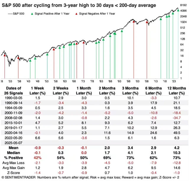 Na závěr nabízím pár grafů, které současnou situaci na americkém akciovém trhu zasazují do historického kontextu. Index S&P 500 stoupl nad 200denní průměr po více než 30denní pauze. Od konce 70. let to s výjimkou takzvaných medvědích rally během hlubokých sestupných trendů v první dekádě 21. století bylo v ročním výhledu pro trh silně pozitivní znamení.
